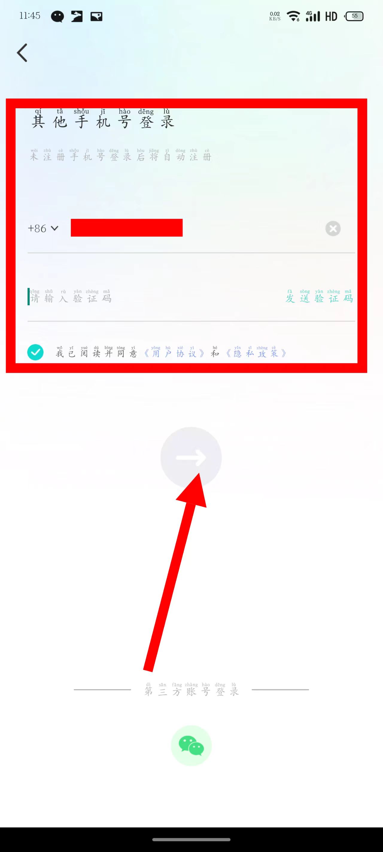 4、输入收到的验证码,勾选后,点击箭头按钮,即可完成注册登录操作。