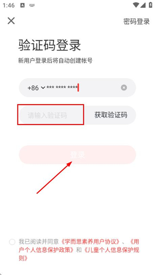 2、在登录页面填写手机号,勾选协议后,点击获取验证码。