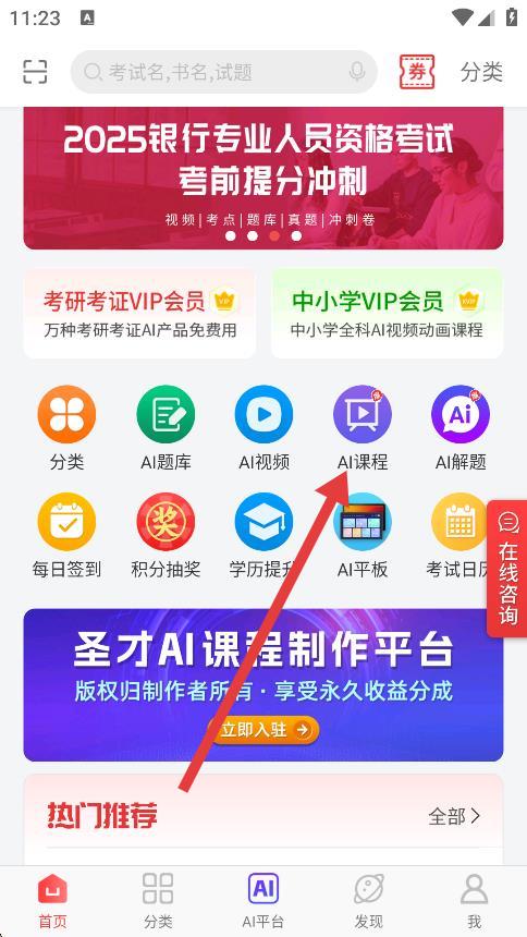 1、打开圣才电子书App,在首页点击AI课程图标。