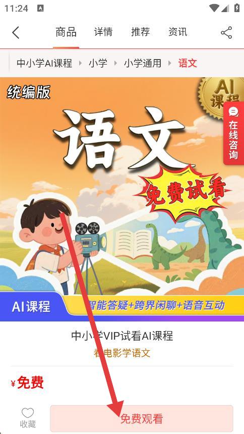 3、在课程商品详情页面,点击下方的免费观看按钮。