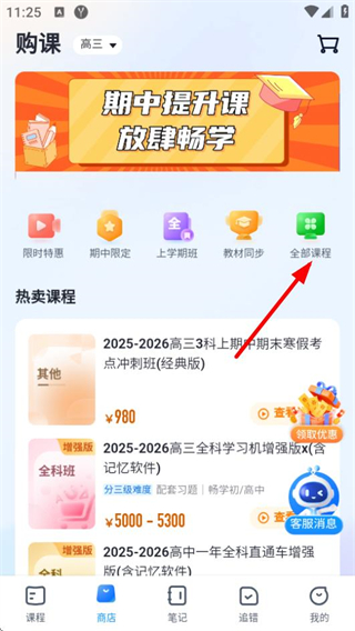 2、在购课页面,点击全部课程选项,进入课程列表页面。