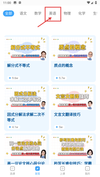 2、在发现页面,点击英语分类,进入英语学习内容列表页。