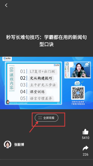 4、在课程播放页面,点击全屏观看按钮,全屏观看该英语课程视频。