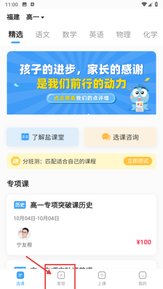1、打开教育类APP,点击底部发现选项,进入发现页面。