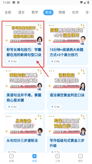 3、在英语学习内容列表里,选择秒写长难句技巧:学霸都在用的新词句型口诀条目,进入课程播放页面。