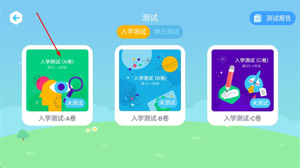 2、在测试分类页面,选择入学测试,进入入学测试选择页面。