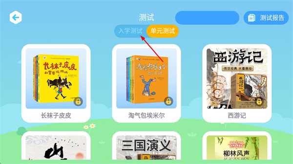 1、在陶陶悦读主页面,点击测试选项,进入测试分类页面。