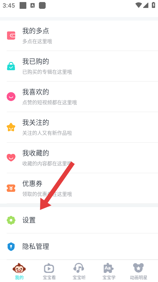 1、在儿歌多多我的页面,点击设置的选项,进入设置的相关界面。