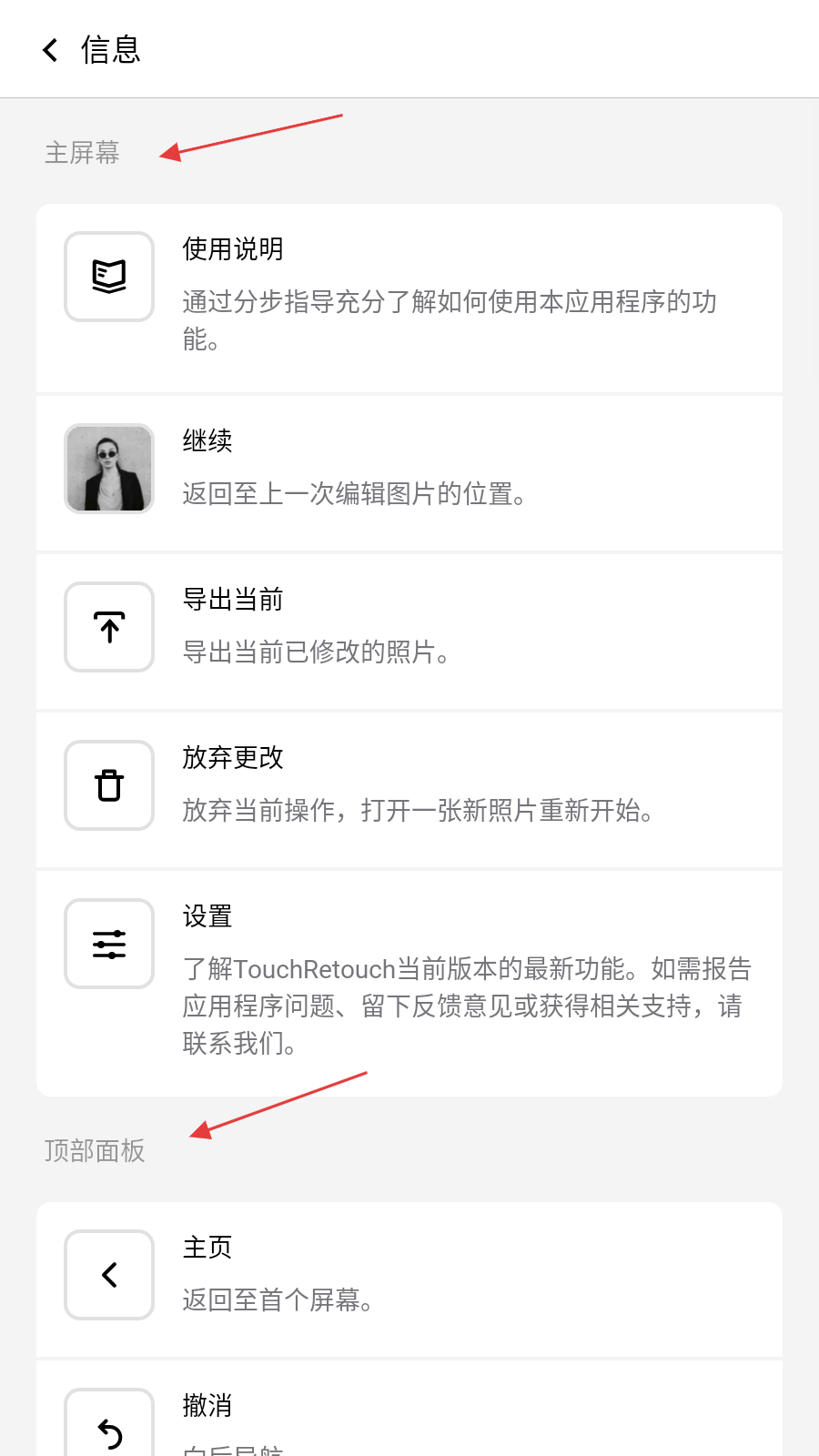 1、打开 TouchRetouch 应用,点击界面右上角的菜单类图标,进入功能选择页面。