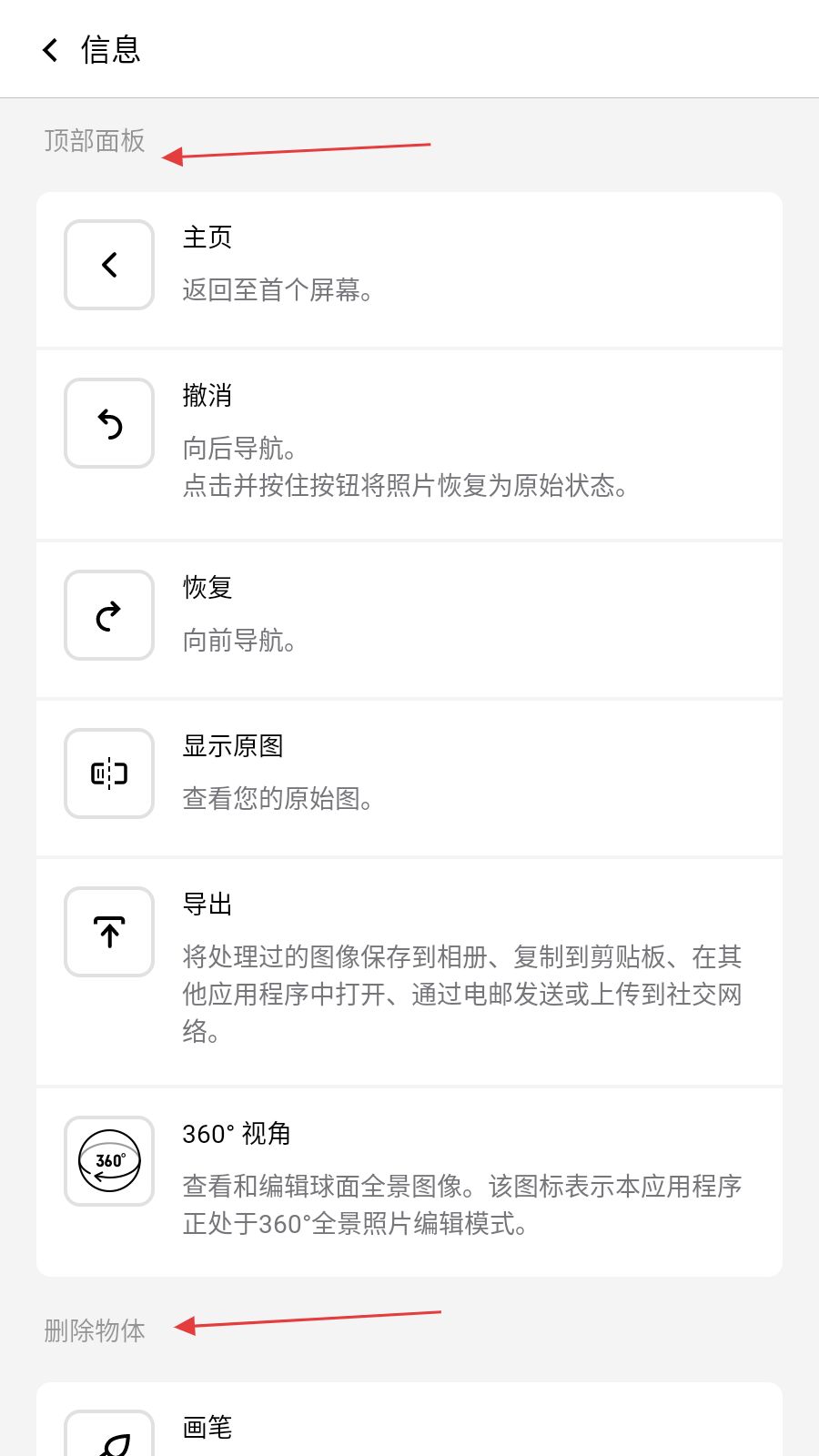 4、查看顶部面板,删除物体,等板块的功能介绍,如撤销,恢复,显示原图,画笔等工具的用途。