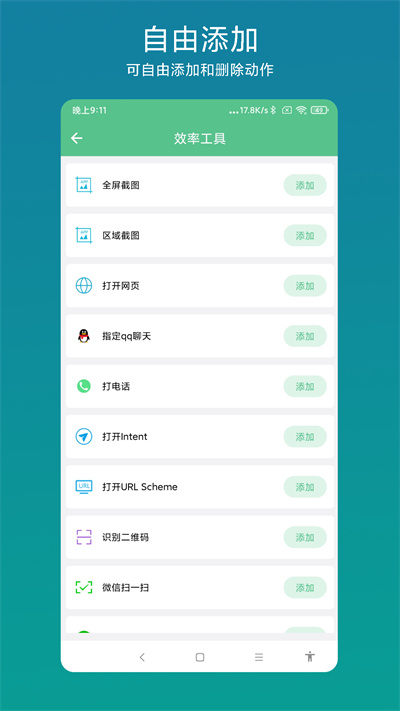 一款手机快捷操作工具APP,可以快速实现全屏截图、区域截图、打开常用APP扫一扫功能、打开常见的收款码和付款码、打开手机系统设置、打开常用APP。软件支持用户自由配置常用指令、配置指令图片、指令名称,同时,可以发送到桌面 ,点击桌面图标即可执行。