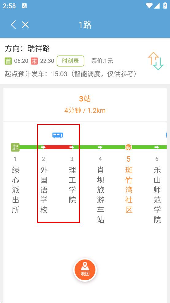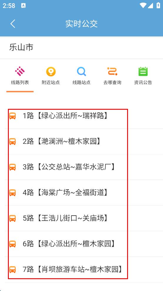 2、在实时公交查询页面,浏览展示的公交线路列表,找到需要查看的线路,点击该线路,进入1路公交的实时信息页面。