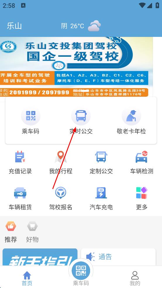 1、打开公交服务软件,进入主界面后,在功能选项中找到“实时公交”选项,点击该选项,进入实时公交查询页面。