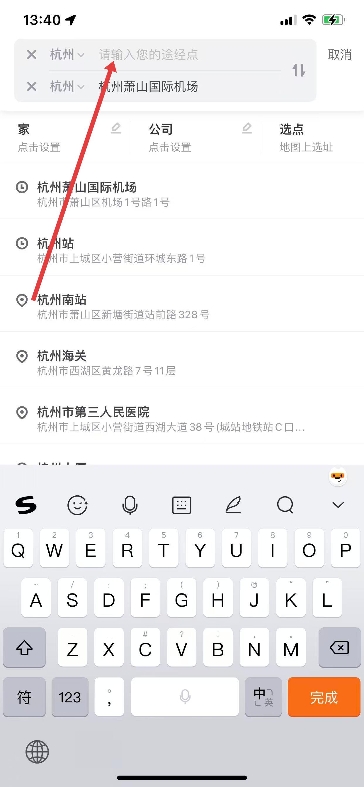 3、在弹出的途经点设置界面中,点击输入框,输入您想要设置的途经点地点。
