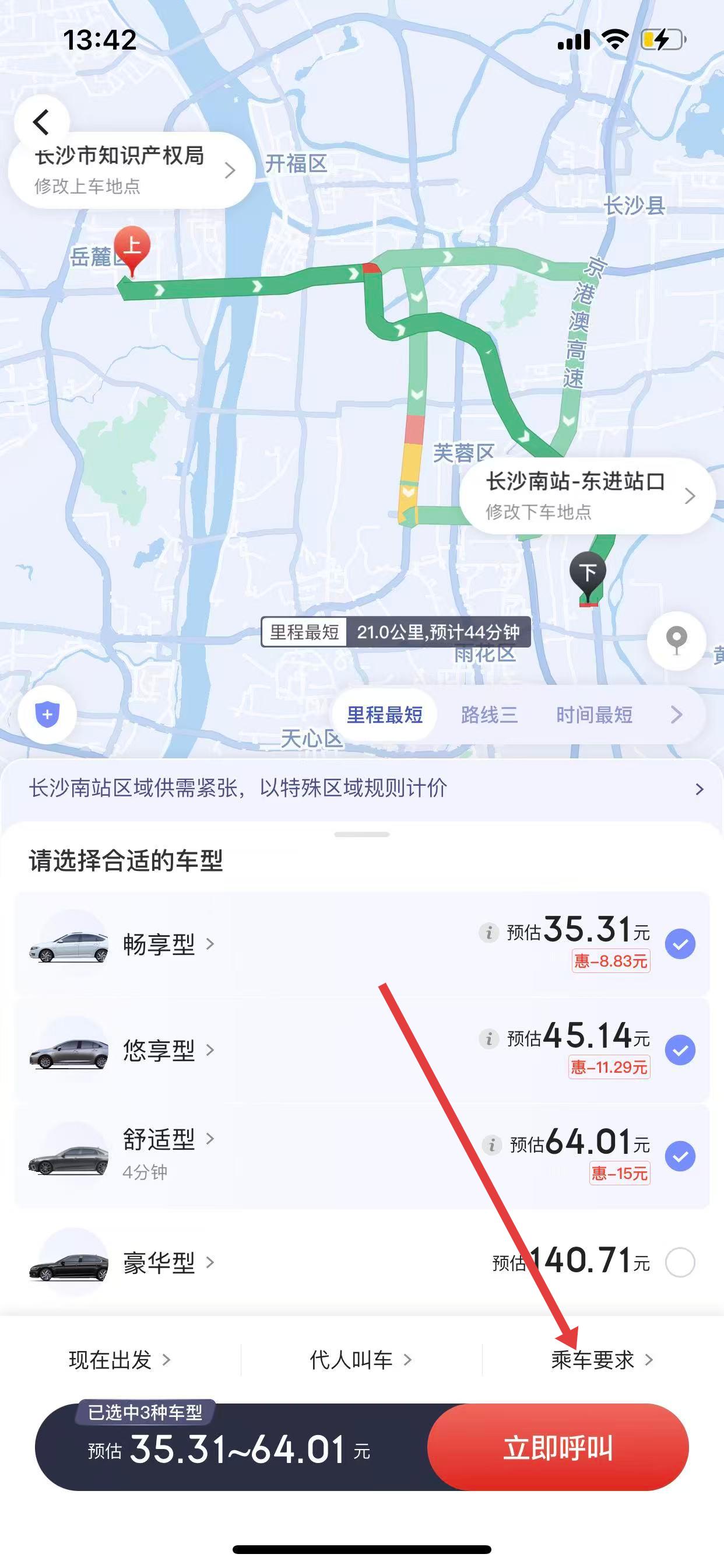 2、选择好出发时间、车型等信息后,点击页面下方的乘车要求。
