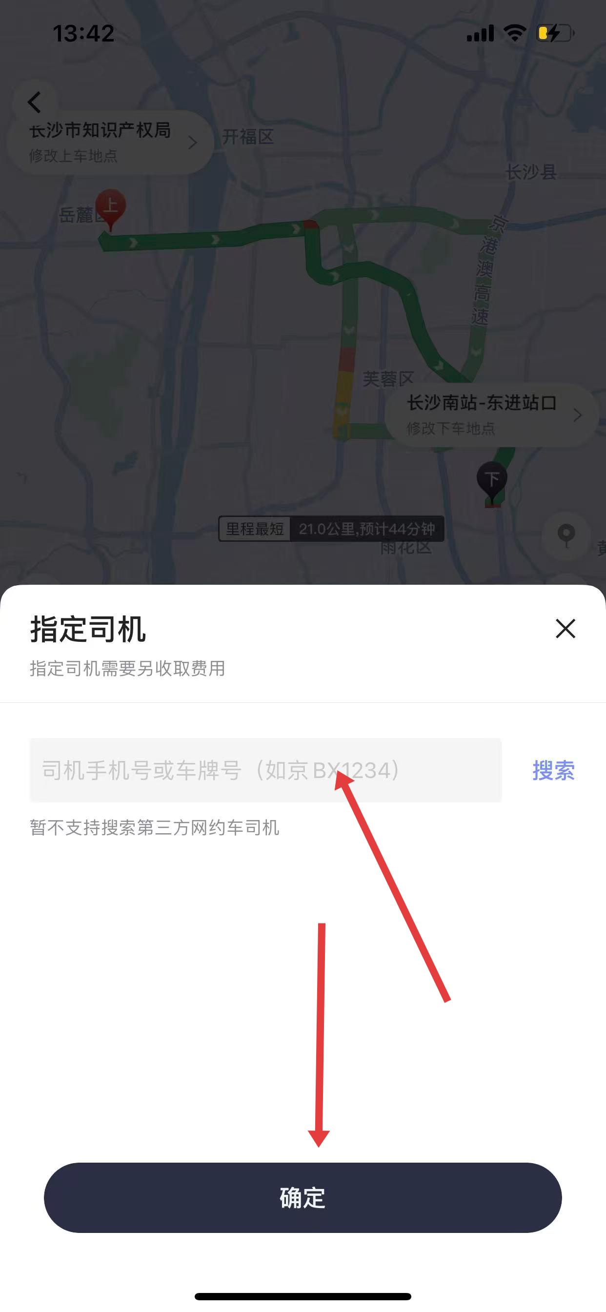 4、在指定司机输入框中,输入司机手机号或车牌号,点击搜索,点击确定。