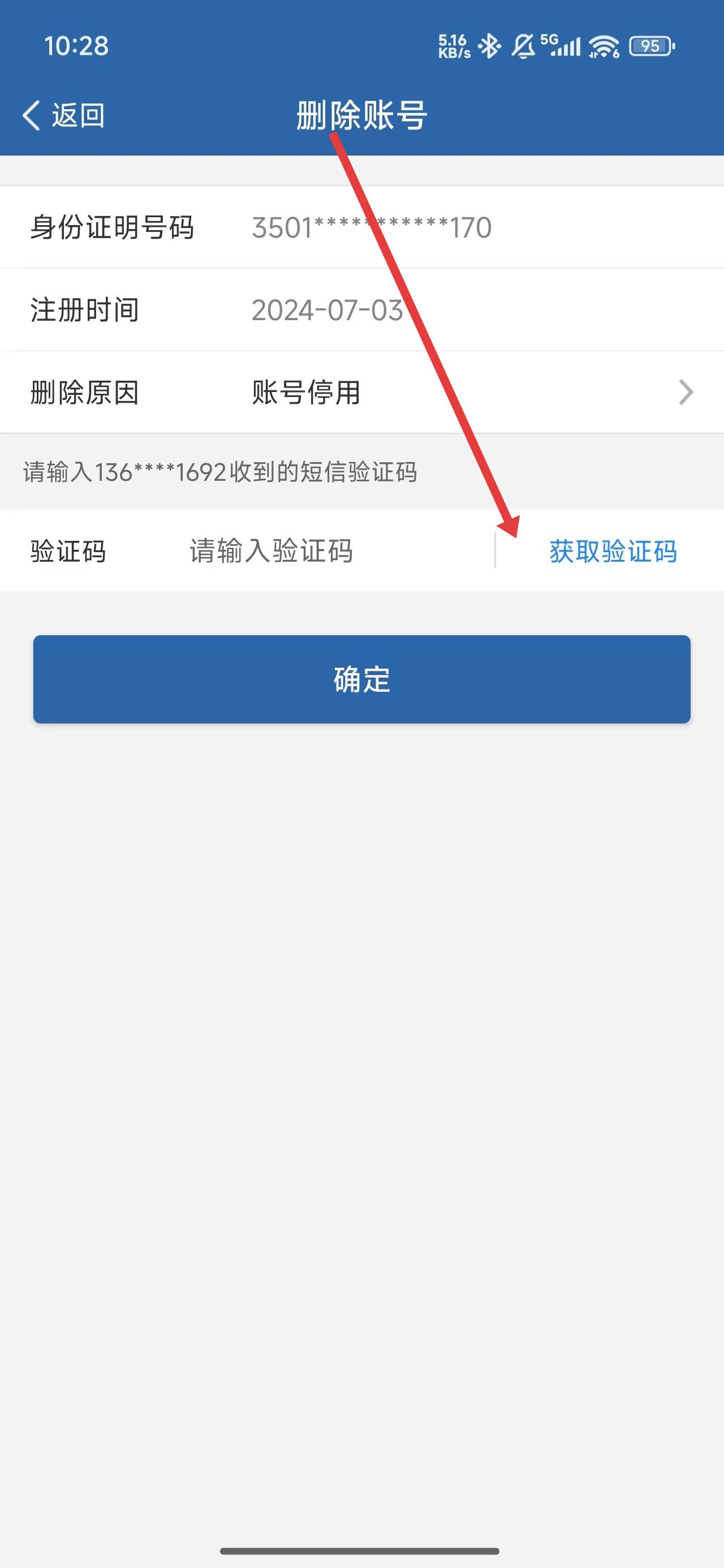 4、点击获取验证码按钮,在填写完验证码后完成删除操作。
