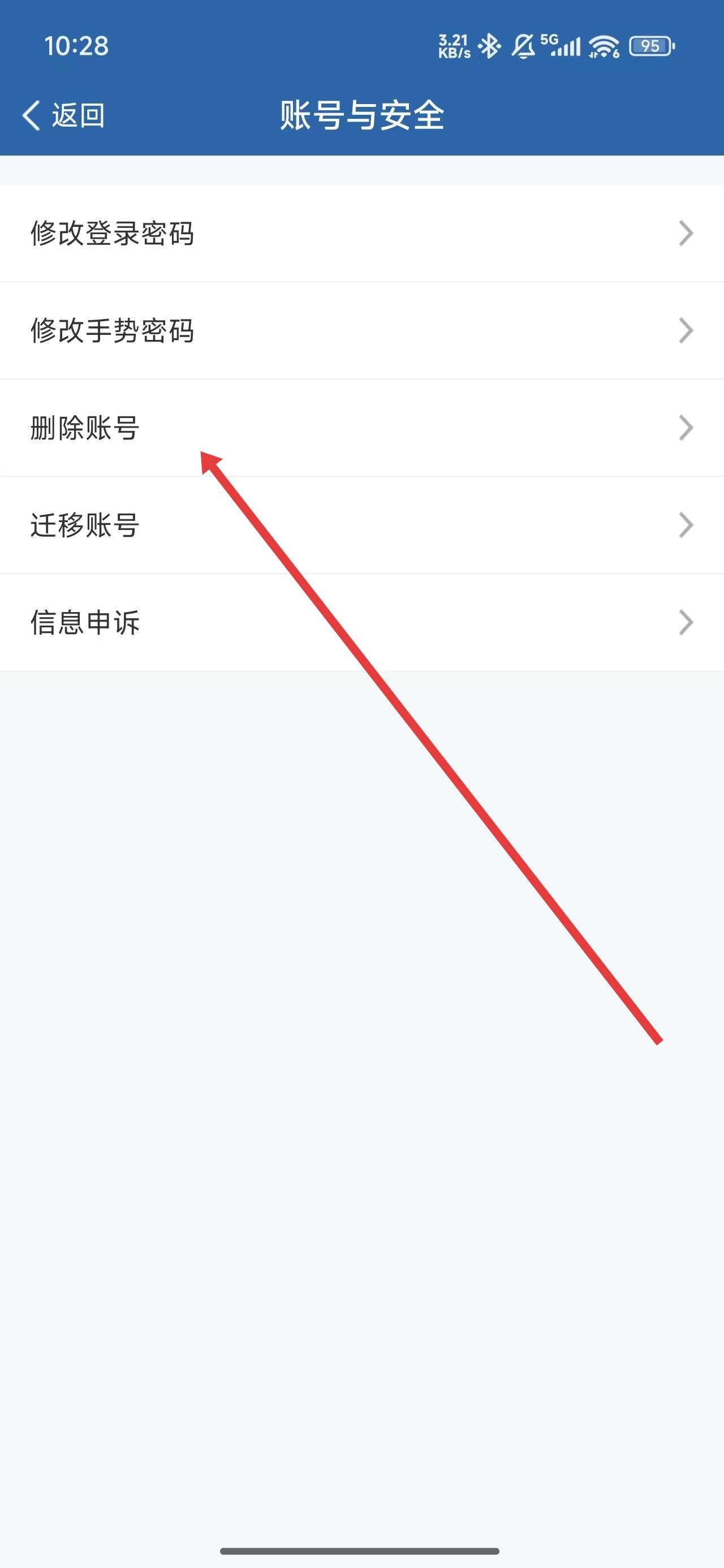 3、在进入到账号与安全页中,可以点击删除账号选项,进行删除操作。