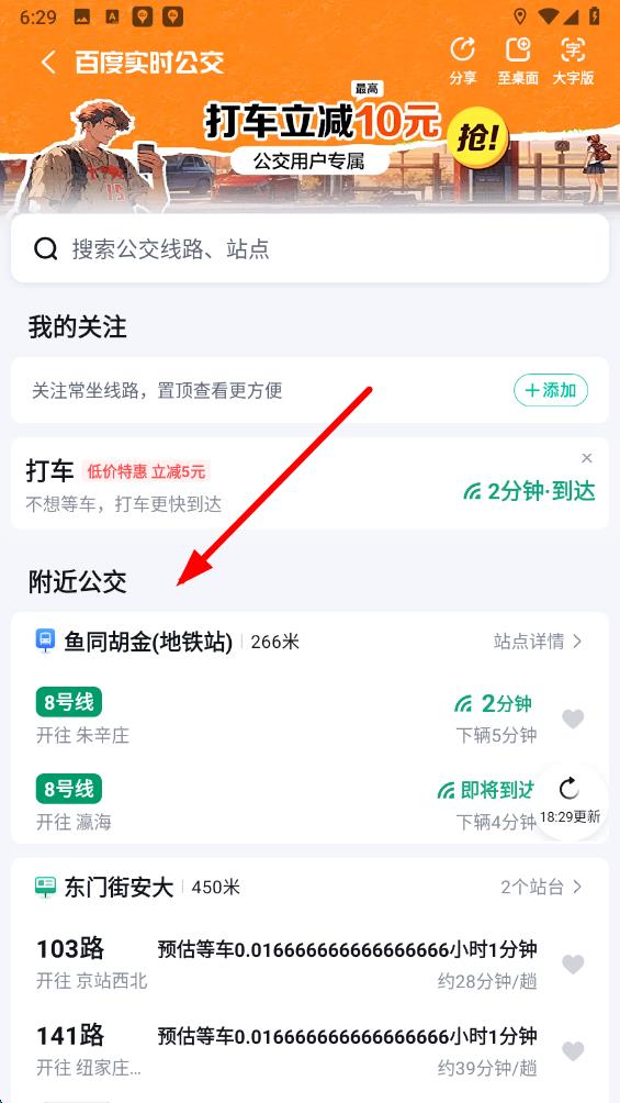 3、在实时公交查询页面的附近公交区域,可查看距离自己较近的公交站点及线路信息,包括公交车的预计到达时间等。