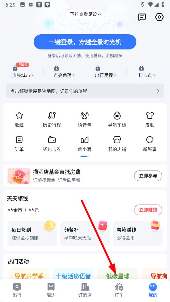 1、打开百度地图应用,点击底部导航栏中的打车选项,进入打车相关界面,准备查找公交功能入口。