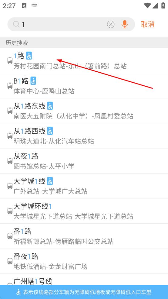 3、在公交查询页面的搜索框中输入要查询的公交线路,或者在历史搜索列表中点击对应的公交线路,如“1路”。