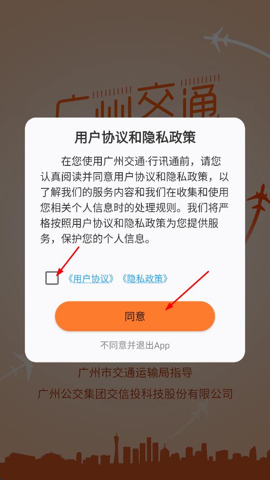 1、打开广州行讯通APP,在弹出的用户协议和隐私政策提示框中,勾选相关协议,然后点击同意按钮。