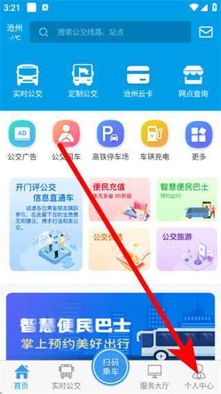 1、打开沧州行,点击底部的个人中心,进入个人页面。