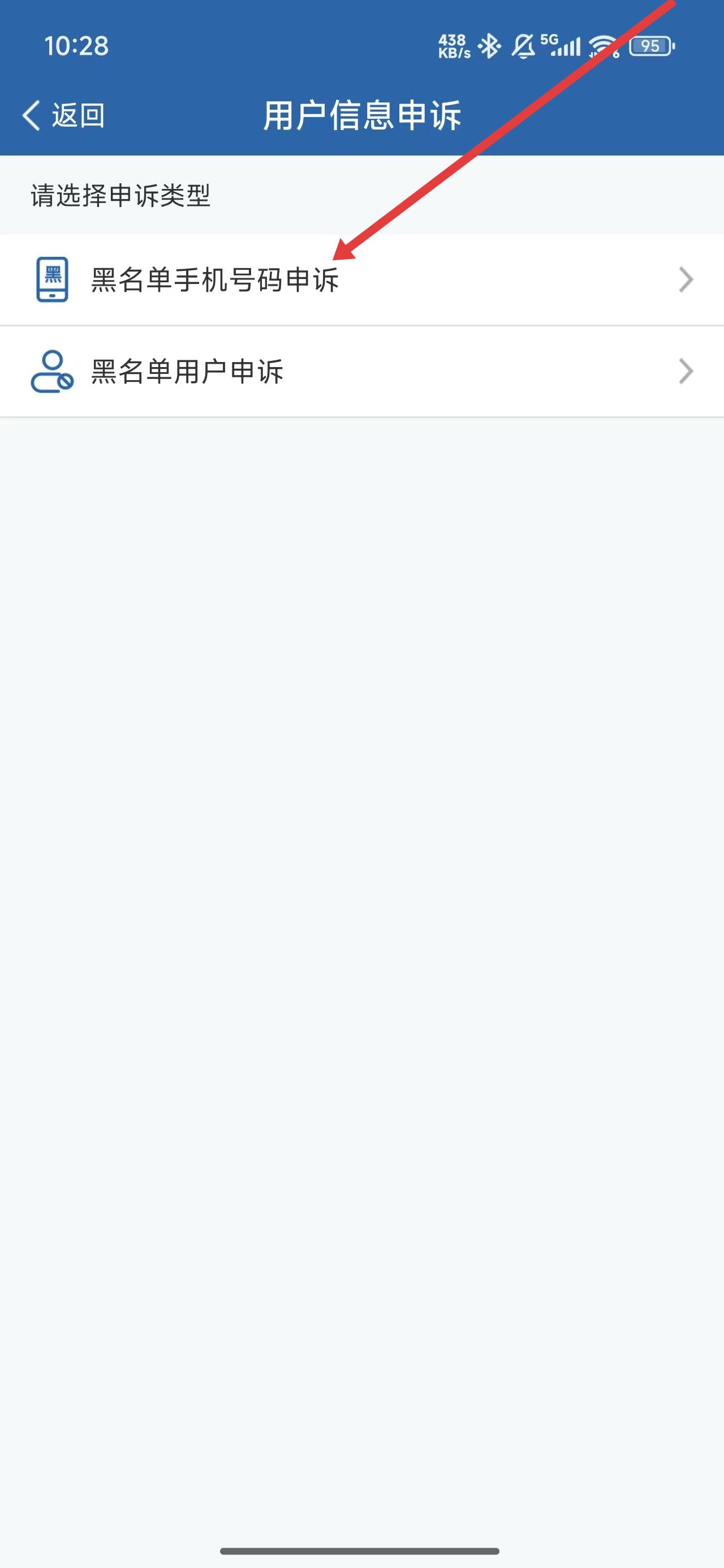 4、在用户信息申诉页面中,可以点击黑名单手机号码申诉选项,使用该申诉方式。