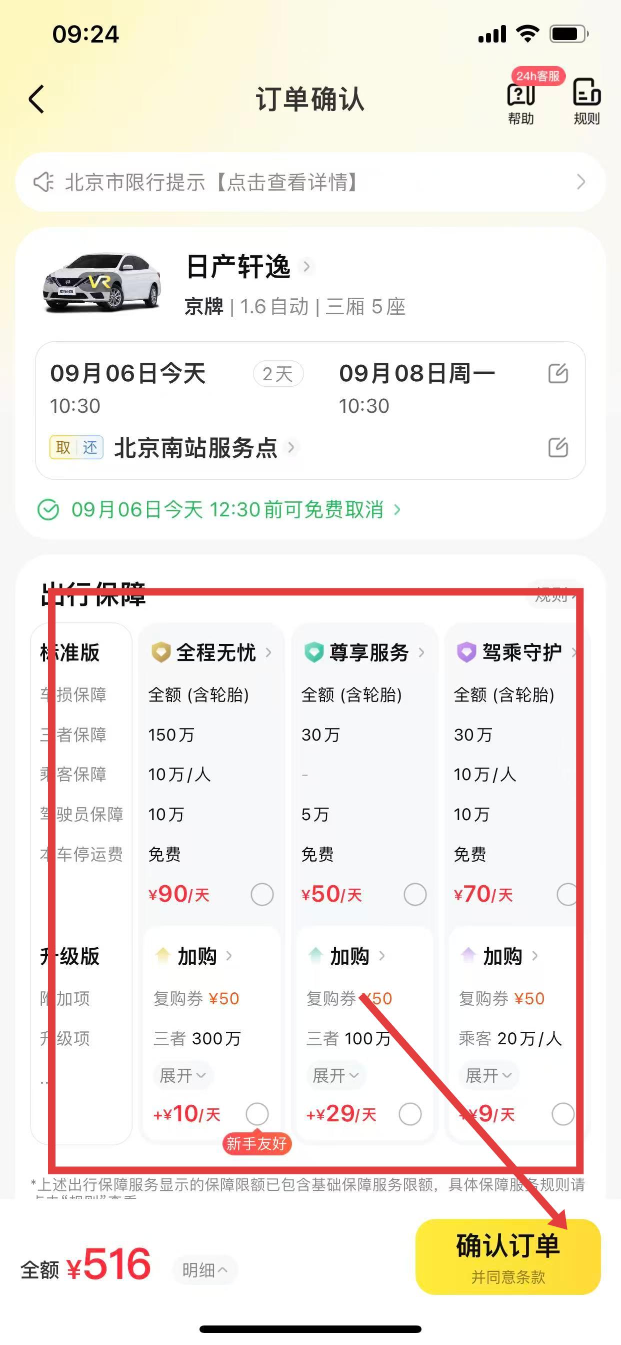 4、进入订单确认页面,可按需选择保险等增值服务,点击确认订单。
