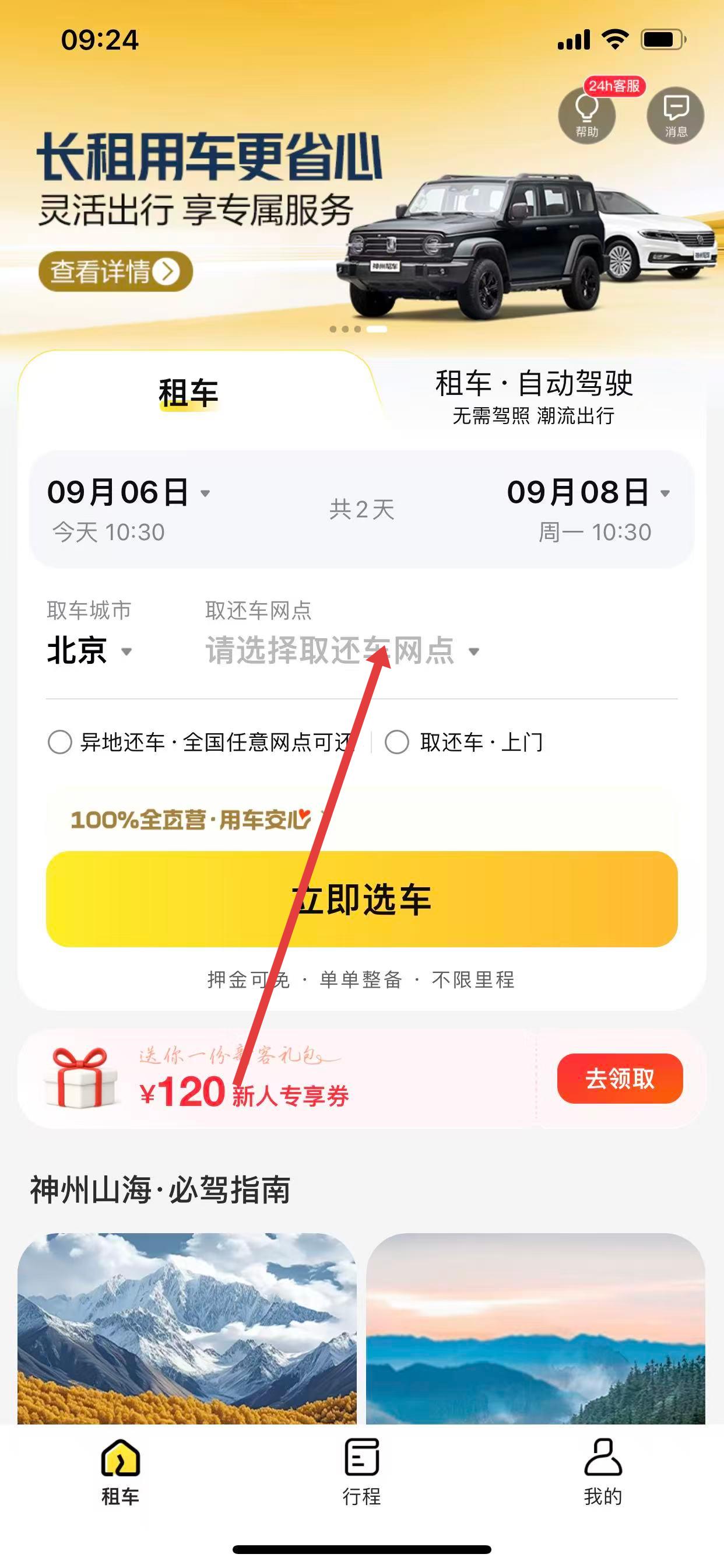 1、打开神州租车App,点击请选择取还车网点,选择具体的取车和还车网点。
