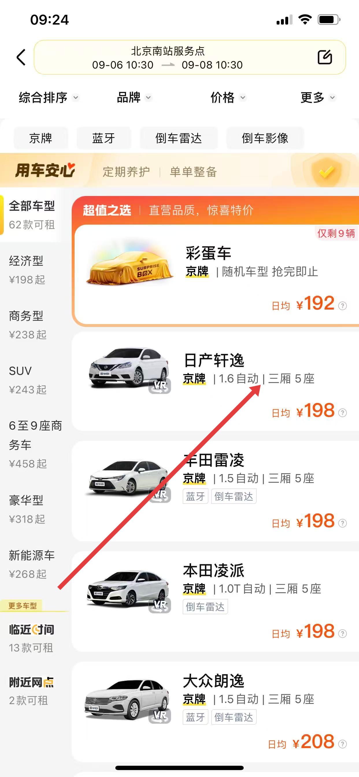 3、选择好取还车网点后,页面会展示可租车辆列表,选择自己想要租赁的车型。