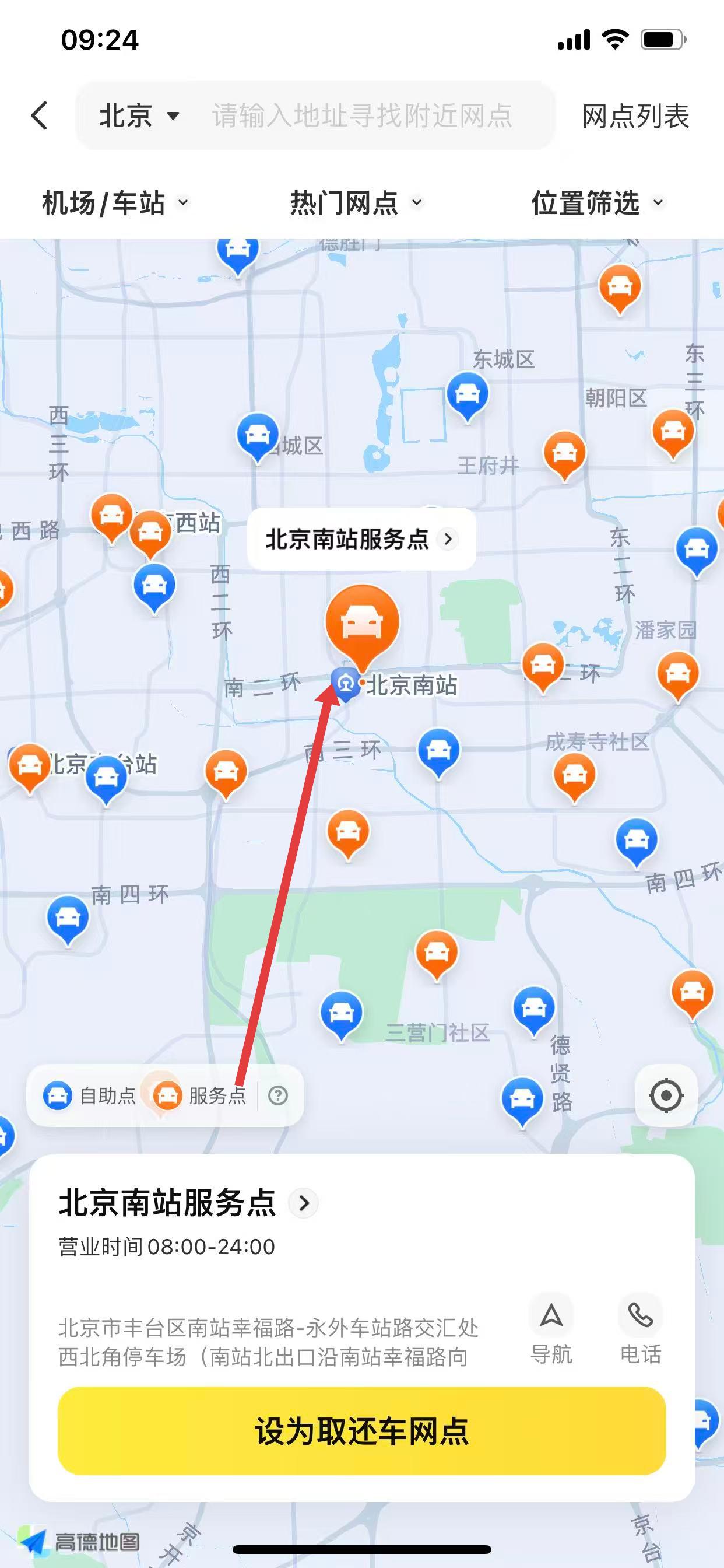2、在地图上会显示各个网点位置,选择一个方便的网点,点击设为取还车网点。
