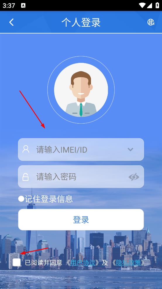 3、在“请输入IMEI/ID”栏填入对应内容,在“请输入密码”栏输入密码,点击“登录”,完成账号登录 。
