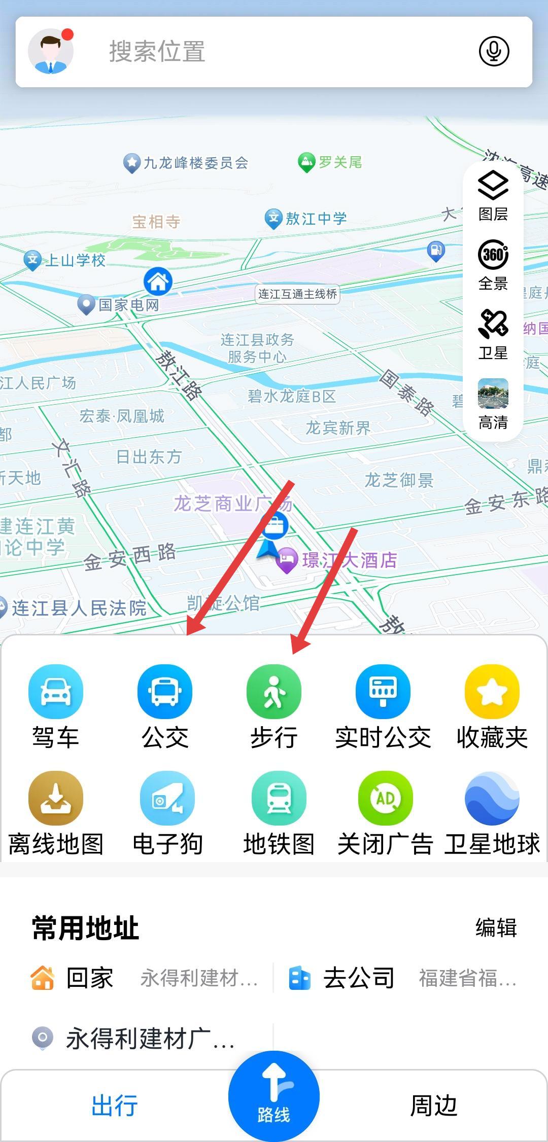 1、打开北斗导航APP,进入地图主界面,在功能栏如底部或展开菜单找到公交、步行图标,可以点击对应选项切换出行模式。