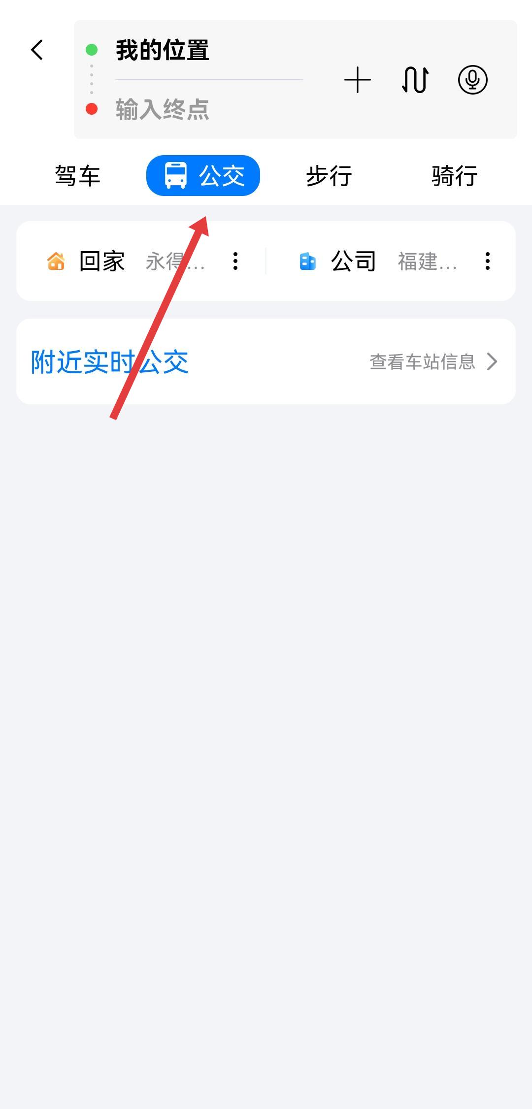 2、切换至公交模式,输入起点和终点,系统自动检索公交路线含实时公交信息、换乘方案,生成最后的导航路径。