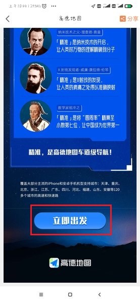 3、拉到最下面就会有一个立即出发的按钮,然后点击立即出发就可以进入车道级导航了。