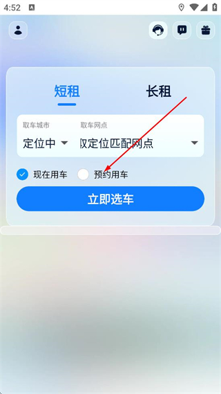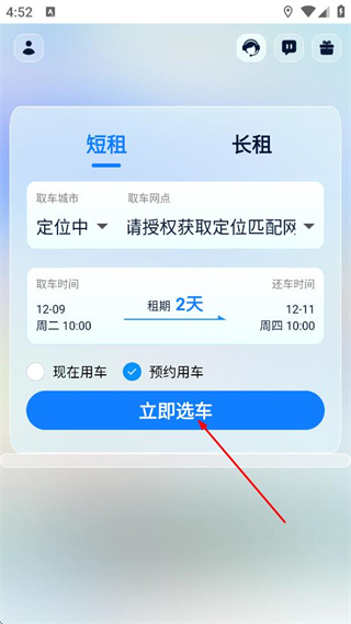 3、在短租页面确认取还车信息后,点击立即选车,将完成后续操作。