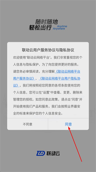 1、在联动云用户服务协议与隐私协议弹窗中,点击同意,进入页面。