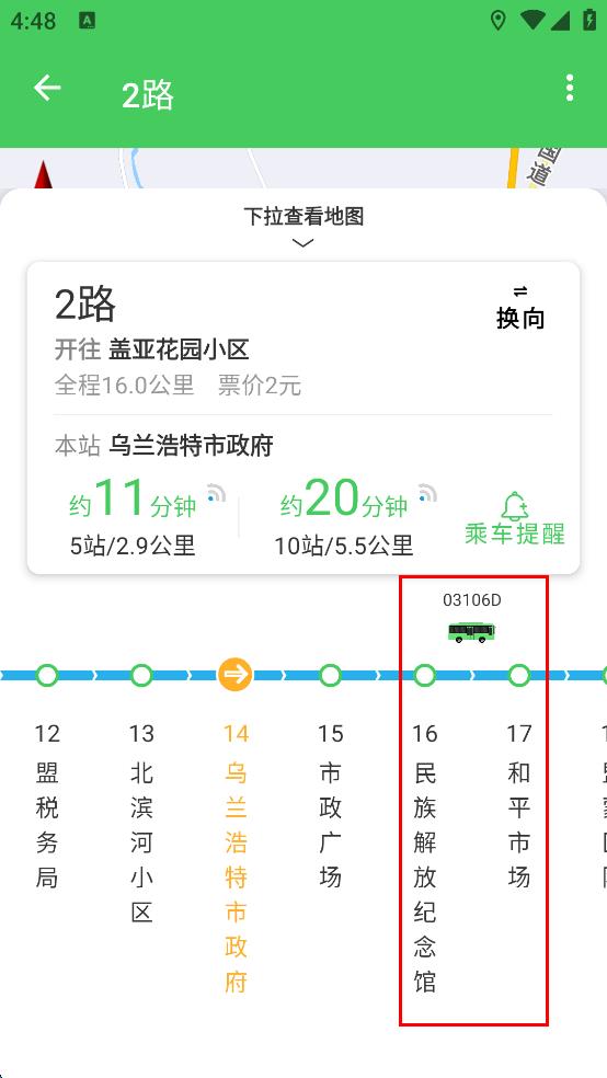 3、进入2路公交详情页面后,可查看该线路的全程信息,包括全程公里数、票价,以及本站后续站点的预计时间、距离等。