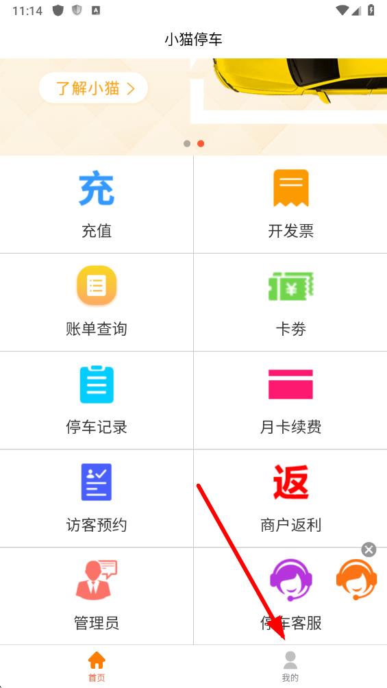 1、打开小猫停车app,点击底部导航栏中的我的选项,进入个人中心页面。