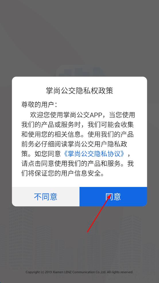 1、打开掌尚公交APP,弹出隐私权政策弹窗,阅读内容后点击同意,进入软件主界面。