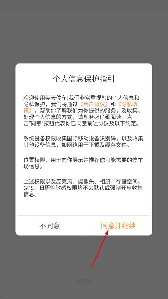 1、打开美天停车软件,弹出个人信息保护指引弹窗,仔细阅读内容后,点击“同意并继续”按钮,进入软件主界面。