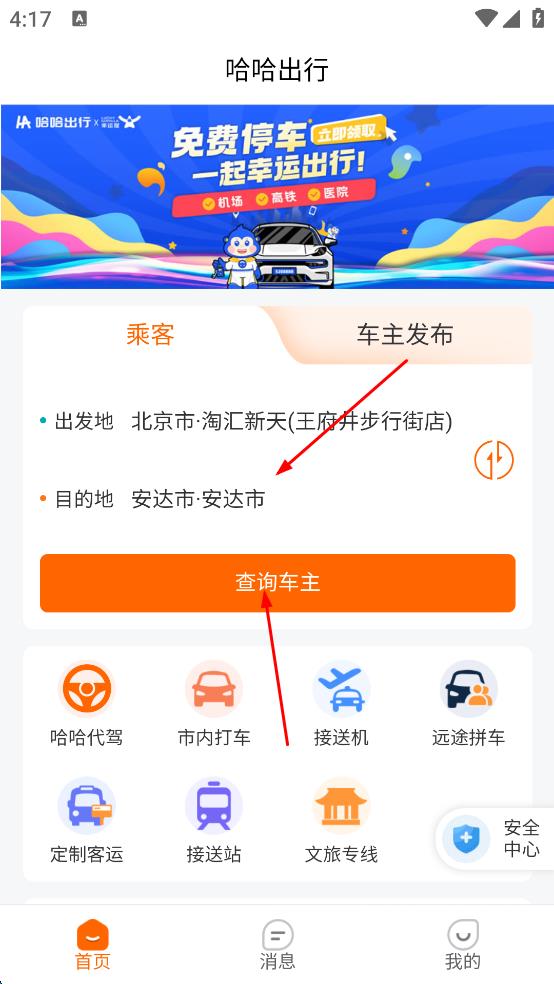 2、登录后回到首页,在乘客板块输入出发地和目的地,点击“查询车主”进入预订页面。