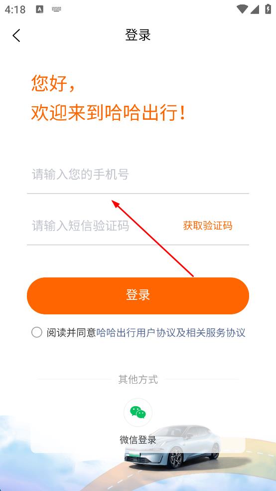1、打开哈哈出行APP,先完成登录,输入手机号和验证码,勾选协议后点击“登录”。