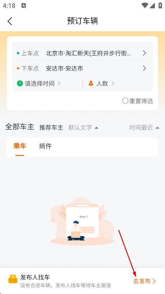 3、若预订页面无合适车辆,点击底部“去发布”,发布找车需求等待车主邀请 。