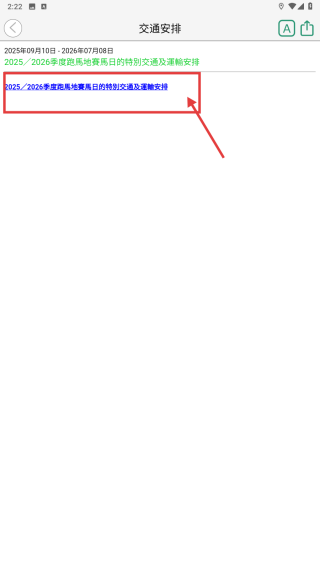 4、在详情页,查看2025/2026季度恩地觅地赛马日的特别交通及运输安排具体内容。