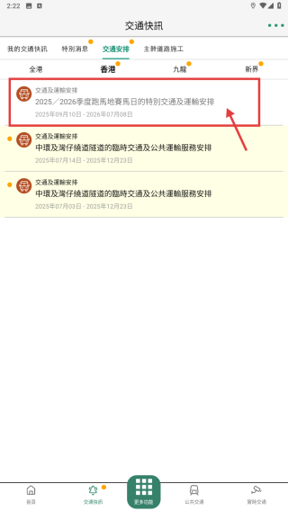 3、在交通事件分类页,找到2025/2026季度恩地觅地赛马日的特别交通及运输安排条目,点击进入详情页。