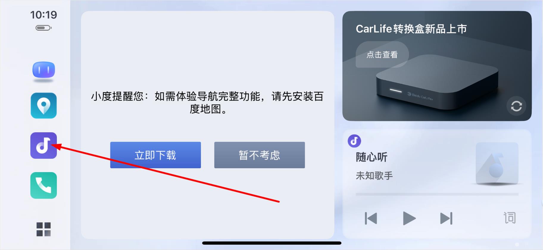 1、打开百度carlife应用,进入主界面后点击左侧列表中的音乐图标。