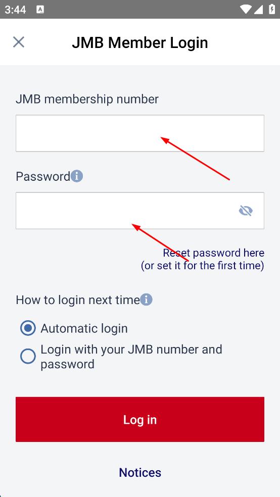 2、在JMB会员登录页面,在“JMB membership number”输入框中填写会员号,在“Password”输入框中填写密码,选择下次登录方式后,点击下方红色“Log in”按钮,完成登录。