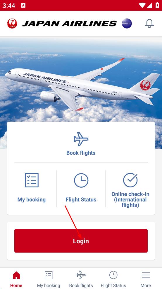 1、打开日本航空软件,在主界面找到红色“Login”按钮,点击该按钮,进入JMB会员登录页面。